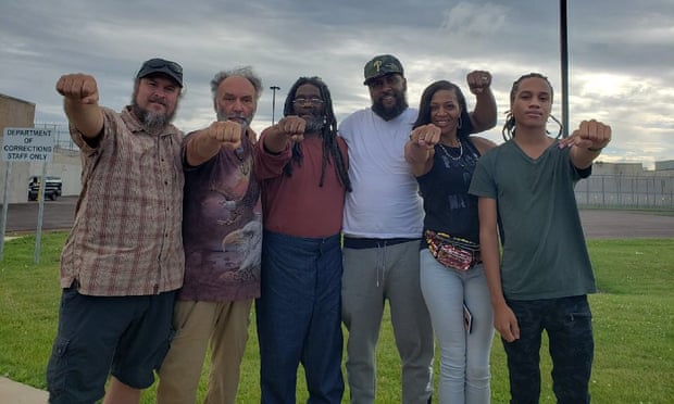 | Eddie Goodman Africa, middle in ochre shirt and blue trousers, is flanked by family members and supporters outside Mahanoy prison in Frackville, Pennsylvania. Photograph: Handout |